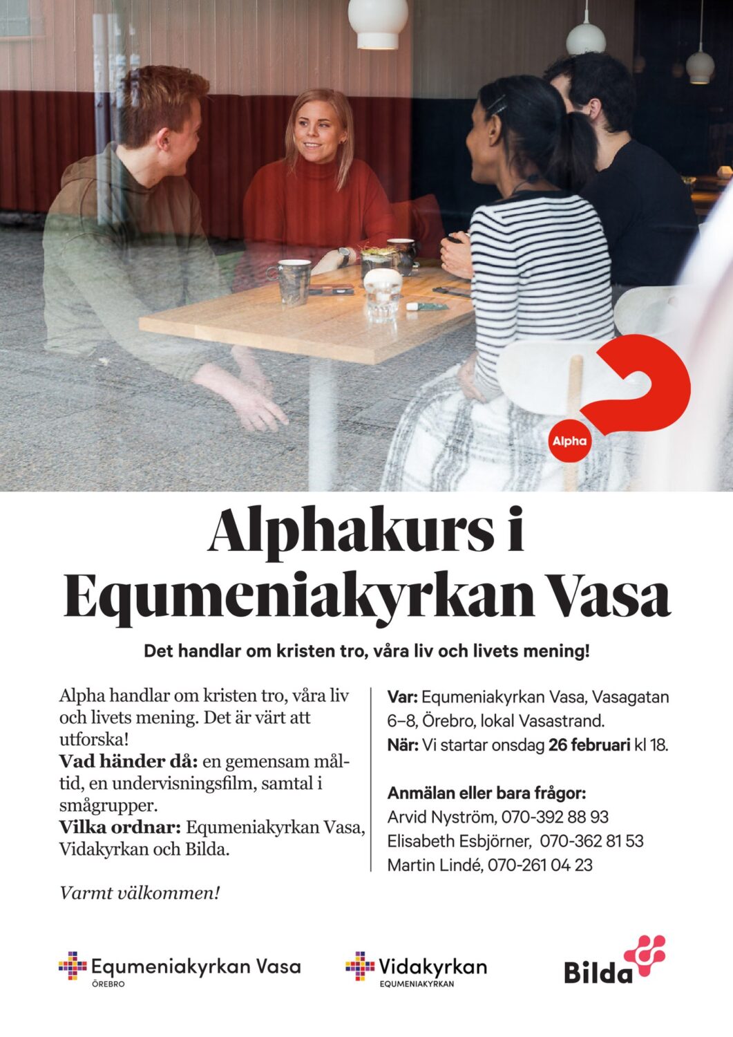 Alpha är en tidsbegränsad grundkurs i kristen tro som kräver anmälan för deltagande. Under våren -25 har vi genomfört en uppskattad kurs tillsammans med Vasakyrkan. Vi planerar att genomföra en ny kurs våren -26. Om du är intresserad är du välkommen att höra av dig. Mer information kommer här under hösten -25. Kostnad: gratis – valfri kostnad för mat.